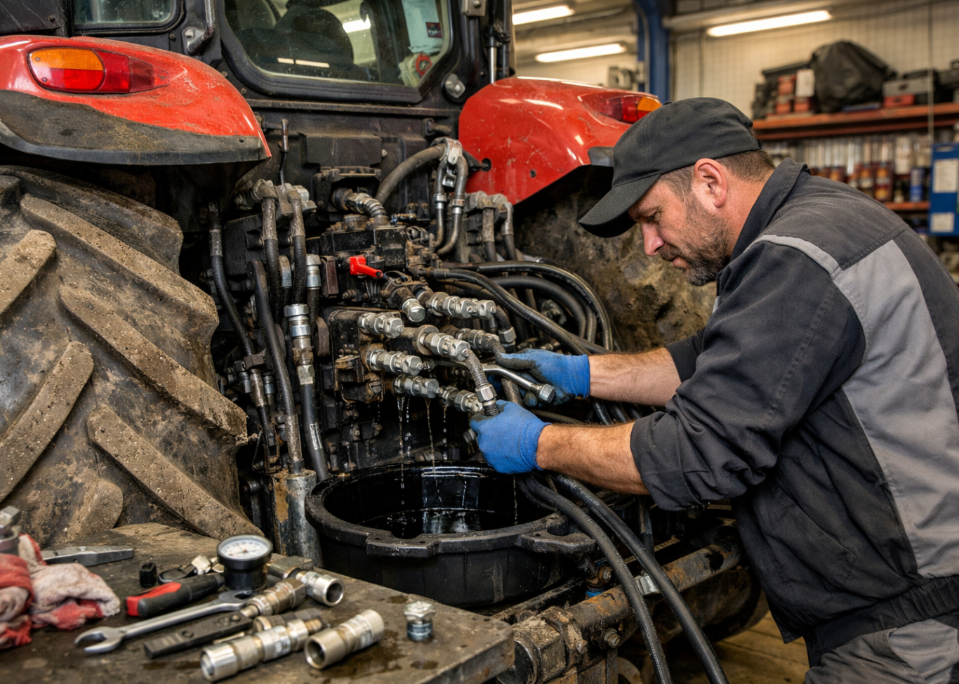 - Kontrolle von Hydraulikschläuchen, Leitungen und Kupplungen